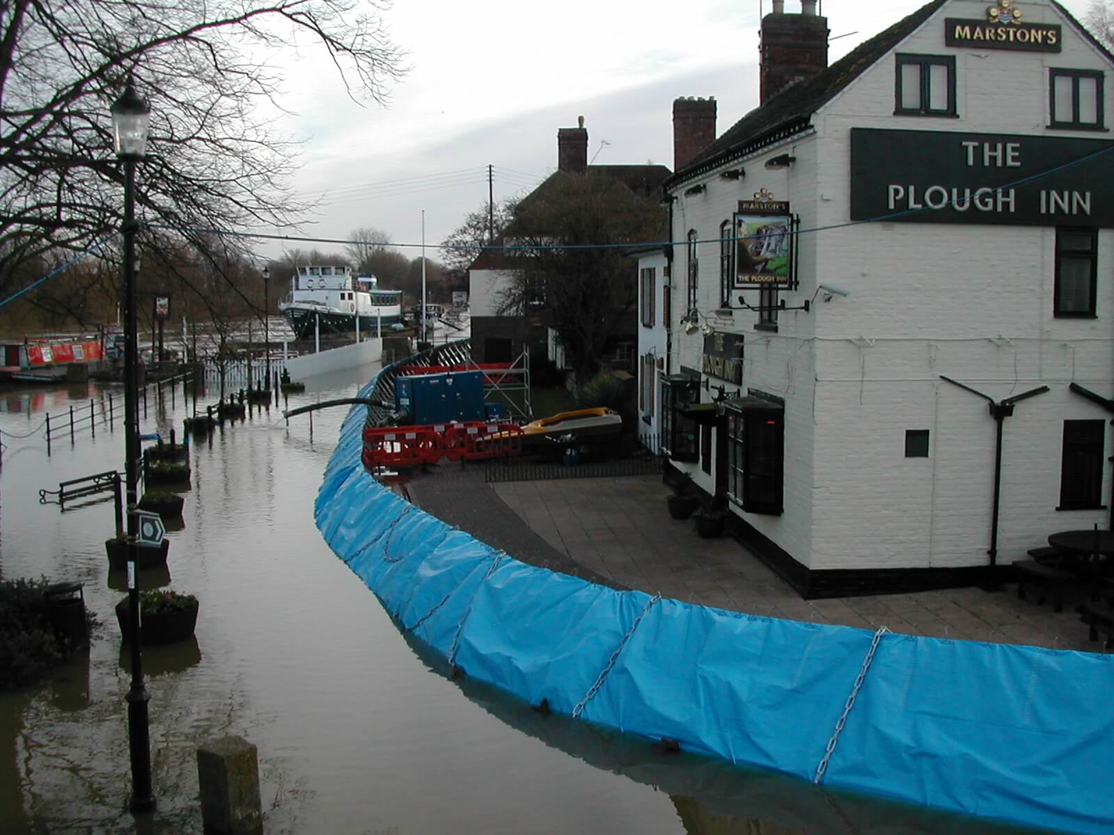 The new millennium saw an increase in the incidence of floods, and temporary barriers, shown here in action, were introduced even before the major flood in 2007. The non-arrival of the barriers in 2007, and the cost of each deployment of the temporary barriers, brought demands by some for permanent defences. The Environment Agency proposed a wall along Waterside and a bund on the sports field.