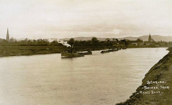The port of Upton upon Severn, along with the river crossing, was a major influence in the growth of the town. Thousands of tons of goods and produce were regularly loaded and unloaded here, needing many trades to support the activity. This picture shows a Severn tug hauling a number of garages downstream from Upton.